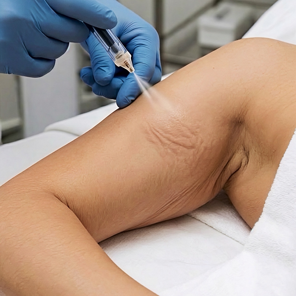 Il protocollo garantisce un rimodellamento profondo con risultati analoghi ai trattamenti iniettivi. OXI-Jet rigenera i tessuti in superficie, mentre l'azione mirata di Ultrasuoni o Radiofrequenza lavora sulla struttura. La silhouette appare ridefinita e la pelle visibilmente più densa e compatta già dalle prime sedute, proprio come dopo un ciclo di trattamenti iniettivi (biorimodellanti o mesoterapia).
